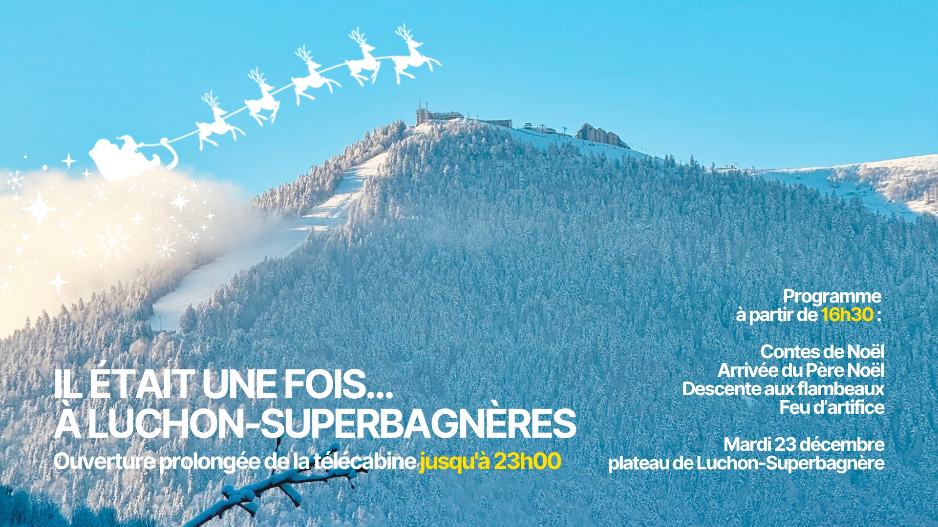 « Il était une fois à Luchon-Superbagnères » : spectacle de contes de Noël avec la présence du Père Noël en personne. Si vous êtes sages, il distribuera certainement des cadeaux. + Descente aux flambeaux & feu d’artifice